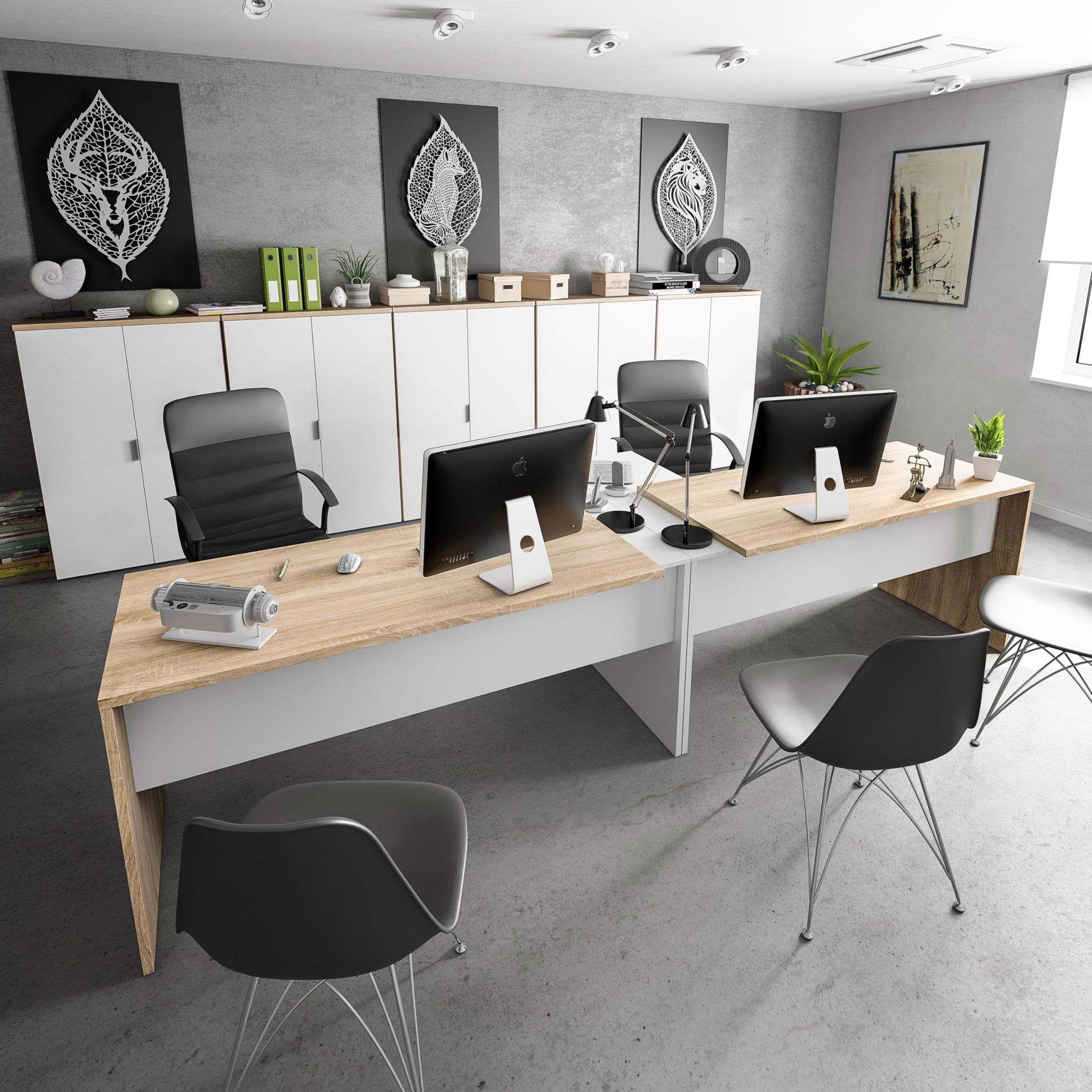 - Mesa de despacho o escritorio modelo Office con buc de 3 cajones y 1 hueco. La mesa es reversible, el buc se puede montar a la derecha o a la izquierda. Incluye tiradores metálicos para los cajones.